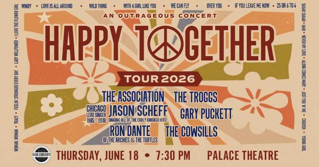 2026 will mark the 17th year of the highly successful, hit-filled summer package, THE “HAPPY TOGETHER” TOUR. The touring sensation that has crisscrossed the nation delighting audiences for over a decade and a half returns this summer with a show full of chart-topping hits from the ‘60s and ‘70s – an undeniable 60+ BILLBOARD Top 40 smashes. The Tour is once again joined by THE ASSOCIATION, THE TROGGS, CHICAGO lead singer 1985-2016 JASON SCHEFF, GARY PUCKETT, RON DANTE from The Archies and The Turtles, and THE COWSILLS.