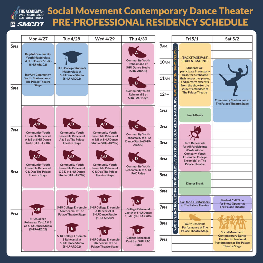 Rehearsals run Monday through Thursday at Seton Hill Arts Center and The Palace Theatre, culminating in Professional Industry Day on Friday. Participants will observe technical rehearsal, take company class, experience backstage life, engage in career focused conversation, and perform for area schools during the Student Matinee. The week concludes with three major performance opportunities: the Youth Community Dance Showcase on Friday evening and opening for Social Movement Contemporary Dance Theatre on Saturday night.