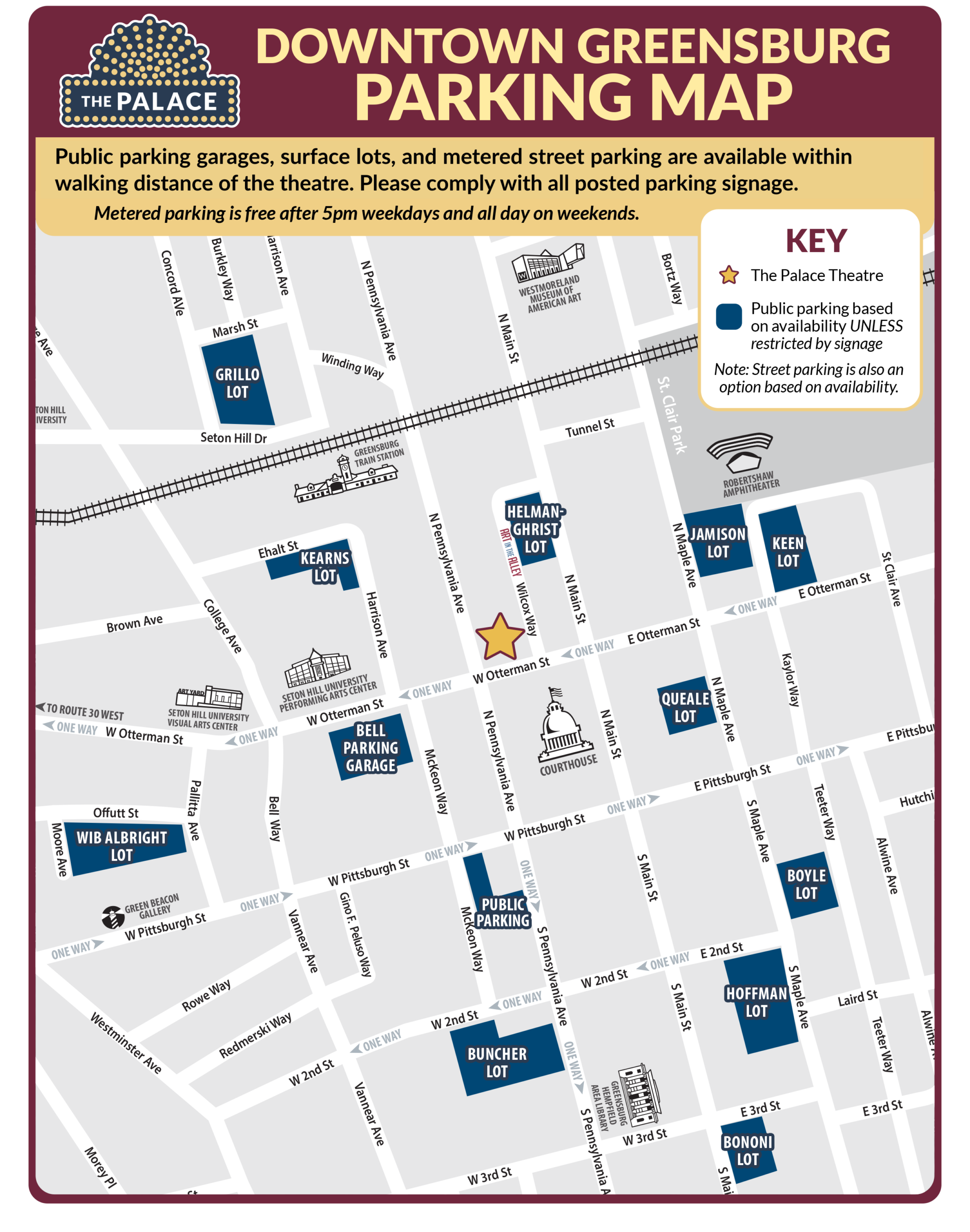 *Westmoreland Cultural Trust and the Palace Theatre are not responsible for accessibility issues at garages or city-owned parking lots.  The Palace Theatre offers convenient drop off directly in front of the theatre. Please contact the box office for more details.
